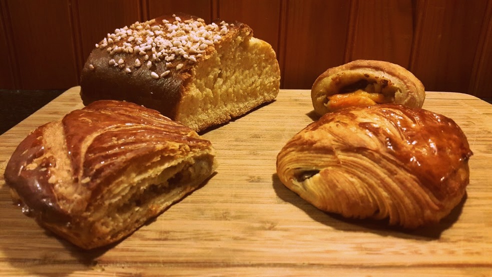 Brioche, pain au chocolat à la banane, pan relleno de queso y lardon y galette de rois