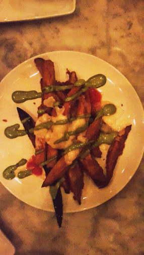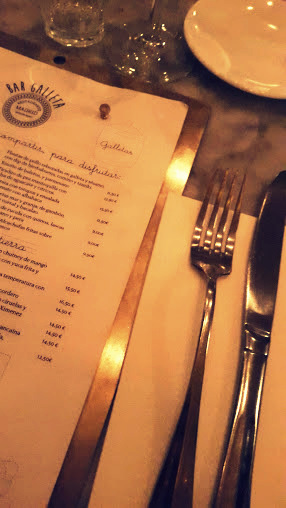Las lámparas, cada una distinta, alumbran, poco, la estancia. En cuanto te sientas a la mesa, te acercan la carta de vinos y el menú. Momento en que quieres leerlo todo y expiezas a exclamar «Oh, mira esto», «no no, esto», «este plato tiene una pinta…». El otro día fue con siete amigos y tuve la suerte de que me dejaron elegir lo que quisiera. Dudé mucho y me tuvieron que ayudar, incluso parar los pies. No veía fondo.