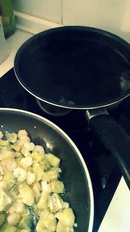 Calentar el agua y vino y cocinar en sartén