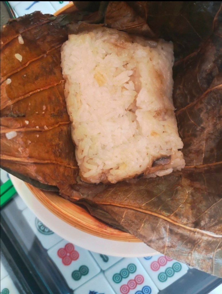 He ye nuo mi ji. Arroz al vapor en hojas de loto con relleno de pollo y char siu