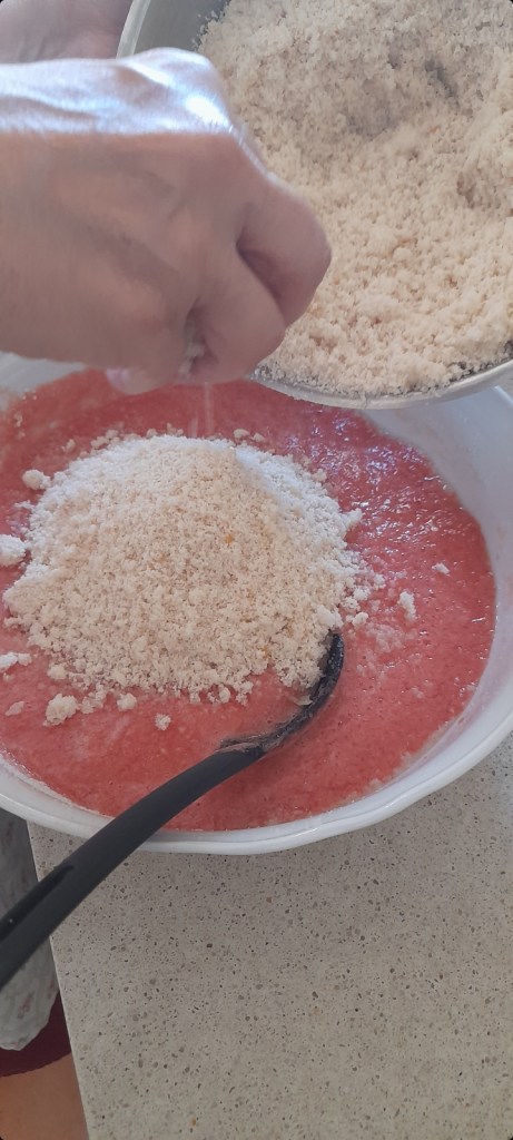 3. Si todo ha ido bien en estos dos pasos, tenemos que tener dos boles: uno con la sopilla esa, y otro con la miga semi triturada. Empezamos a integrar la miga en la sopilla. No vamos con todo de golpe porque vamos a ir midiendo la textura. Ponemos 2 o 3 cucharadas e integramos. Y repetimos. Probamos y rectificamos de sal y de aceite. Buscamos que la textura sea algo más jugosa. Esto es un poco como el pan con chocolate: hay que ajustar y puede que no cuadren cantidades al 100%. Dependerá de si lo queremos más espeso o más líquido. Si sobra sopilla, pues la guardamos para otro plato (u otro arranque). Si sobra miga, al congelador.