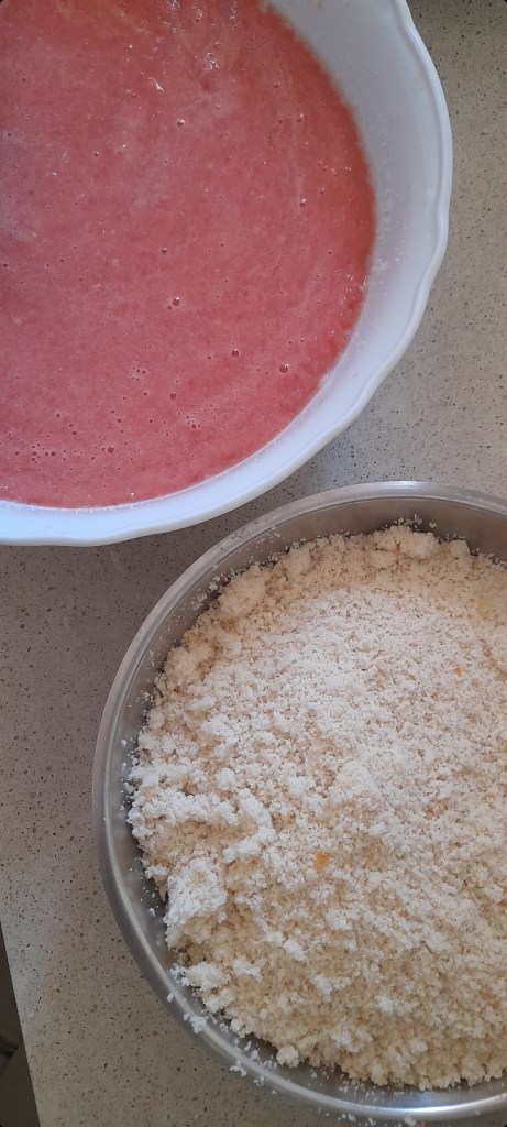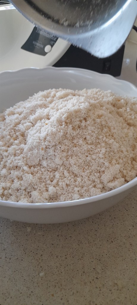 1. Separamos la miga de la corteza del pan de telera. Reservamos la corteza (ya veréis para qué) y trituramos la miga. No tiene que quedar como harina, pero sí que esté semi semi. Es lo que le dará esa textura tan característica.  Si se quiere, se puede hacer este paso días antes y congelar la miga en una bolsa de congelados.