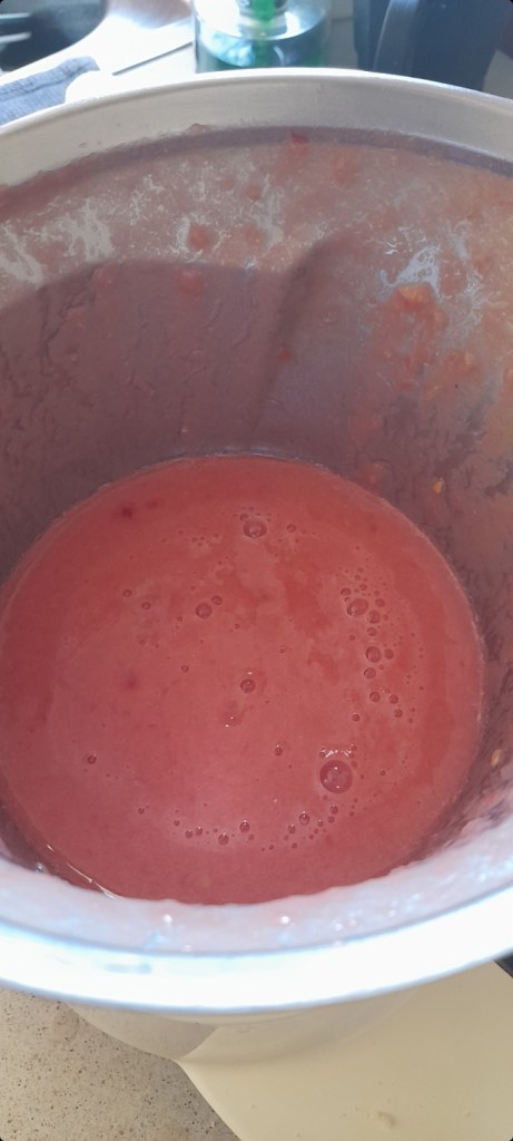 2. Trituramos junto el diente de ajo (yo eché medio recuerdo nuevamente), la sal y el pimiento cortado en trozos. Añadimos los tomates (pelados, recuerda) y seguimos triturando. Que nos quede como una sopa. Y asegúrate de que el ajo y el pimiento se trituran bien, por favor.