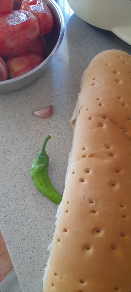 5. Se sirve con la corteza del pan de telera que separamos en el paso 1, cortada, o con trozos de pimiento verde. A modo de cuchara. Regañás, picos… todo le va a esta delicia.