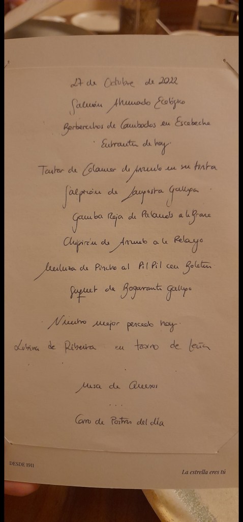 No hay carta. Hay un menú que comienza con salmón ahumado de Coruñesas, dos aperitivos y prosigue con una selección de entre 3 y 6 entrantes, carro de quesos y carro de postres. Piel de gallina de escribirlo y recordarlo.